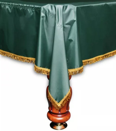 Данный чехол на бильярдный стол подходит для стола размером в 12 футов, это влагостойкое зелёное покрывало с жёлтой бахромой по краям. Изготовлено оно из нейлона с влагостойкой пропиткой. Такое покрывало смотрится очень стильно и уместно, оно прекрасно дополнит интерьер любого бильярдного клуба или бильярдной комнаты. Так что такое покрывало позволит сэкономить на использовании чистящих средств. Особый уход за покрывалом не требуется, при появлении на нем загрязнений достаточно лишь протереть его влажной тряпочкой, и оно будет выглядеть как новое.