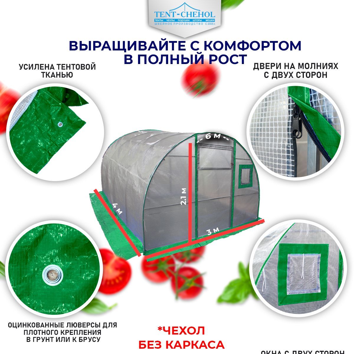 Чехол на теплицу длиной 4 метра, шириной 3 метра. Высота - 2,1 м. Предназначен для покрытия арочных (полукруглых теплиц).Чехол продается для готового каркаса, в комплекте каркаса нет.