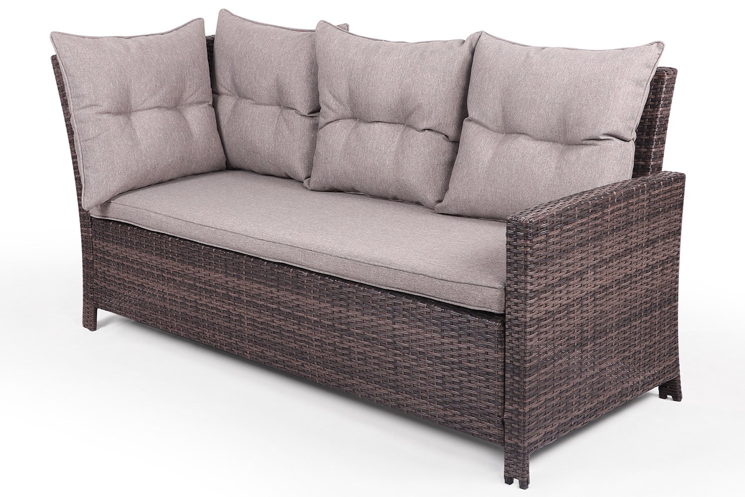 Набор представляет собой угловой диван и стол в одном стиле коричневого цвета с подушками и матрасом серо-коричневого цвета. Вся конструкция состоит из стали (каркас), искусственного ротанга (декоративный элемент, похожий на переплетение дерева, но на самом деле состоит из синтетических волокон, которые отлично выдерживают нагрузки от природных условий) и закалённого стекла (рабочая поверхность стола). Подушки и матрас имеют съемные чехлы из 100% полиэстера, материала с такими полезными свойствами, как водонепроницаемость, прочность и долговечность.
